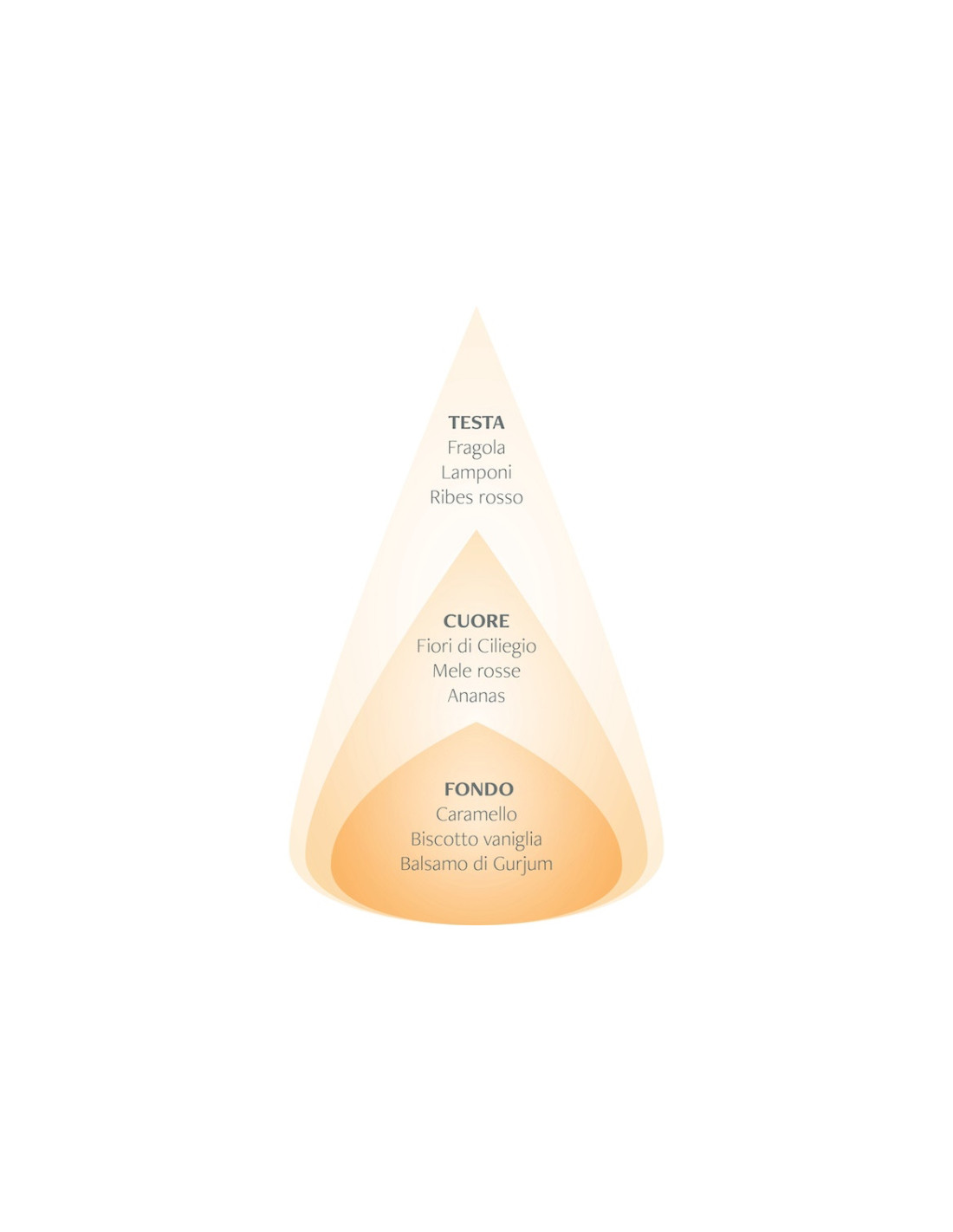 La nota di testa è costruita attorno al profumo succoso dell’Arancia rossa che ricorda le tradizioni familiari come il Natale, con i suoi dolci, le sue decorazioni e soprattutto con la gioia dello stare insieme. Le note del Limone verde e del Mandarino arricchiscono l’accordo olfattivo di una sfaccettatura. Il cuore, fresco e avvolgente, unisce le note del Bergamotto e dello Zenzero che si dissolvono in un fondo speziato di Cannella di Ceylon e Chiodi di Garofano che esaltano la caratteristica gourmand della fragranza.