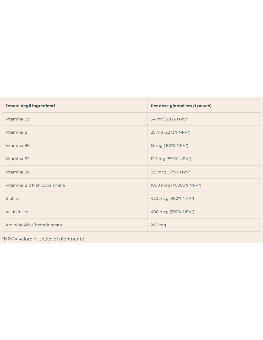 Acqua, Fruttosio, Arginina Alfa-Chetoglutarato, Vitamina B3 (Niacina), Vitamina B1 (Cloroidrato di Tiamina), Vitamina B2 (Riboflavina), Vitamina B5 (Calcio D-pantotenato), Vitamina B6 (Cloroidrato di Piridossina), Biotina, Acido Folico, Vitamina B12 (Metilcobalamina), acidificante: Acido citrico, Sucralosio, aromi, conservanti: Potassio sorbato, Sodio benzoato, addenstante: Gomma xantana.