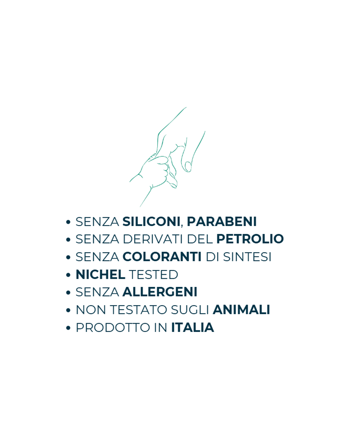 Senza siliconi, parabeni e derivati del petrolio - Senza coloranti di sintesi - Nichel tested - Senza allergeni - Non testato sugli animali - Prodotto in Italia