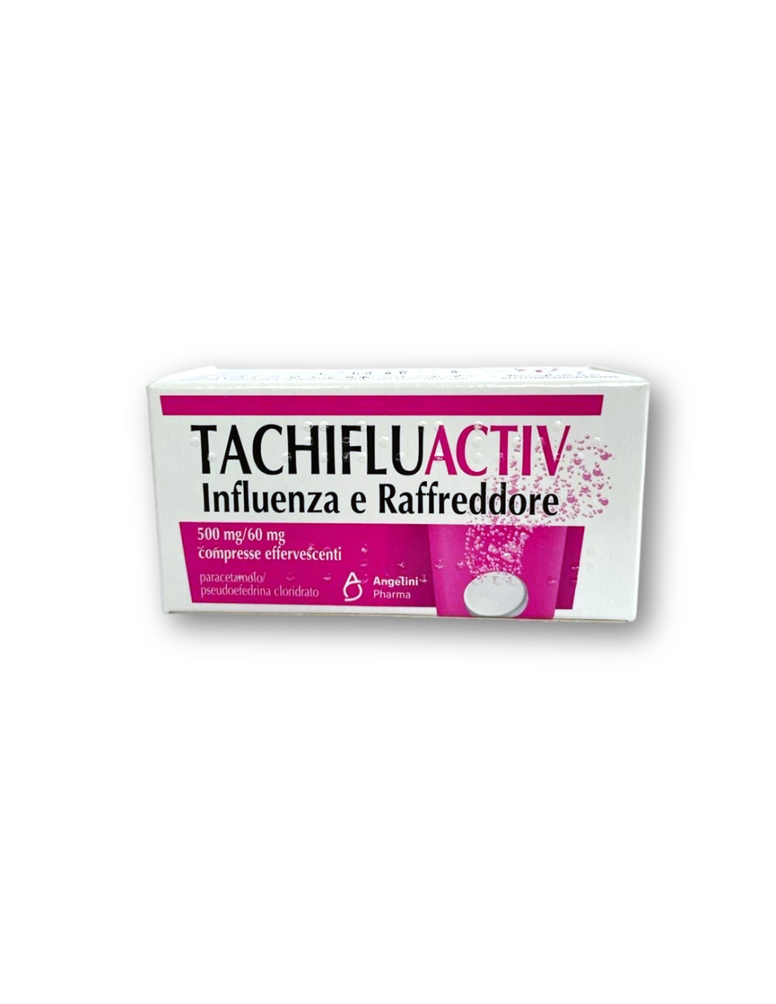Tachifluactiv, in compresse effervescenti, combatte i sintomi influenzali e del raffreddore. Contiene i principi attivi paracetamolo e pseudoefedrina che agiscono contro il dolore, la febbre e il naso chiuso. Indicato dai 12 anni in su.