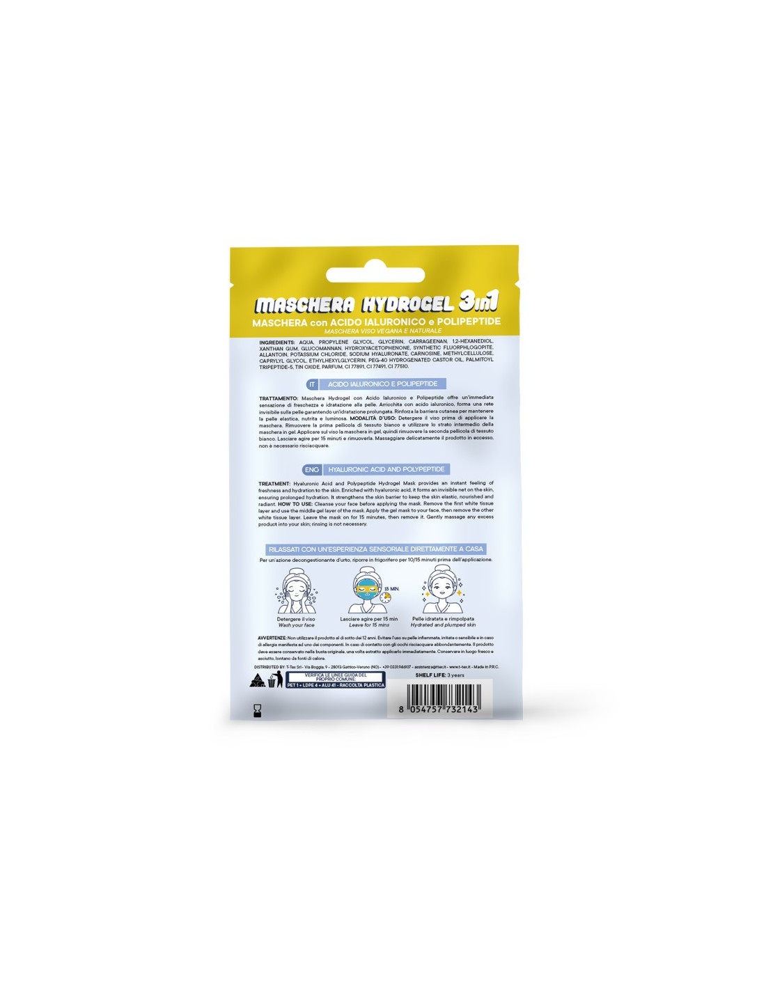 Maschera Hydrogel con Acido Ialuronico e Polipeptide offre un'immediata sensazione di freschezza e idratazione alla pelle. Arricchita con acido ialuronico, forma una rete invisibile sulla pelle garantendo un'idratazione prolungata. Rinforza la barriera cutanea per mantenere la pelle elastica, nutrita e luminosa. Il materiale di origine naturale di cui è composta è biodegradabile e si dissolve in acqua calda con temperatura superiore a 60°C .
