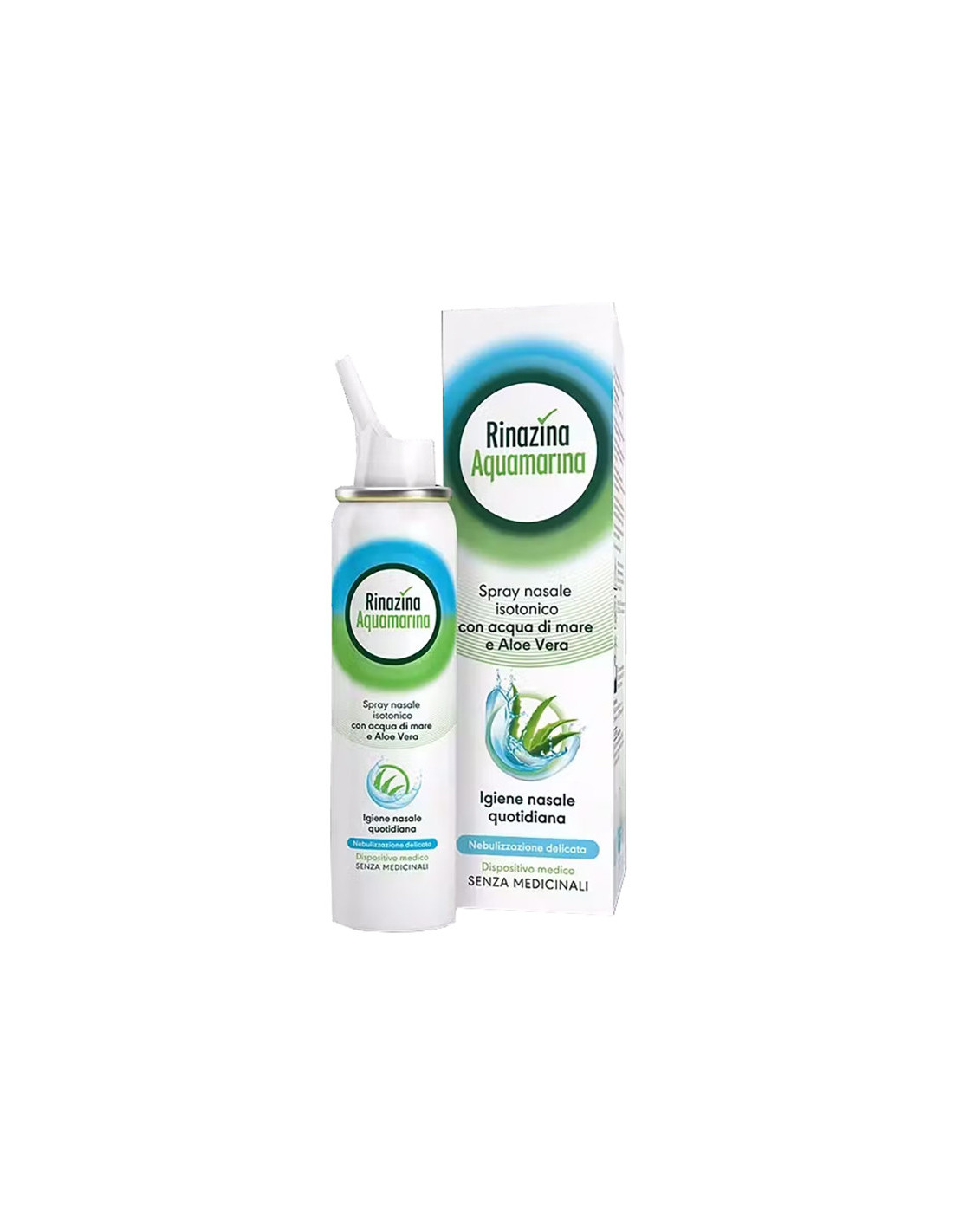 Rinazina Aquamarina è una soluzione salina spray isotonica senza medicinali e senza conservanti, che permette di detergere delicatamente e idratare le vie nasali. Favorisce la funzione di filtro del naso, rimuove il muco in eccesso, polveri e pollini, aiuta a respirare meglio. Con aloe vera nota per le sue proprietà emollienti e idratanti.