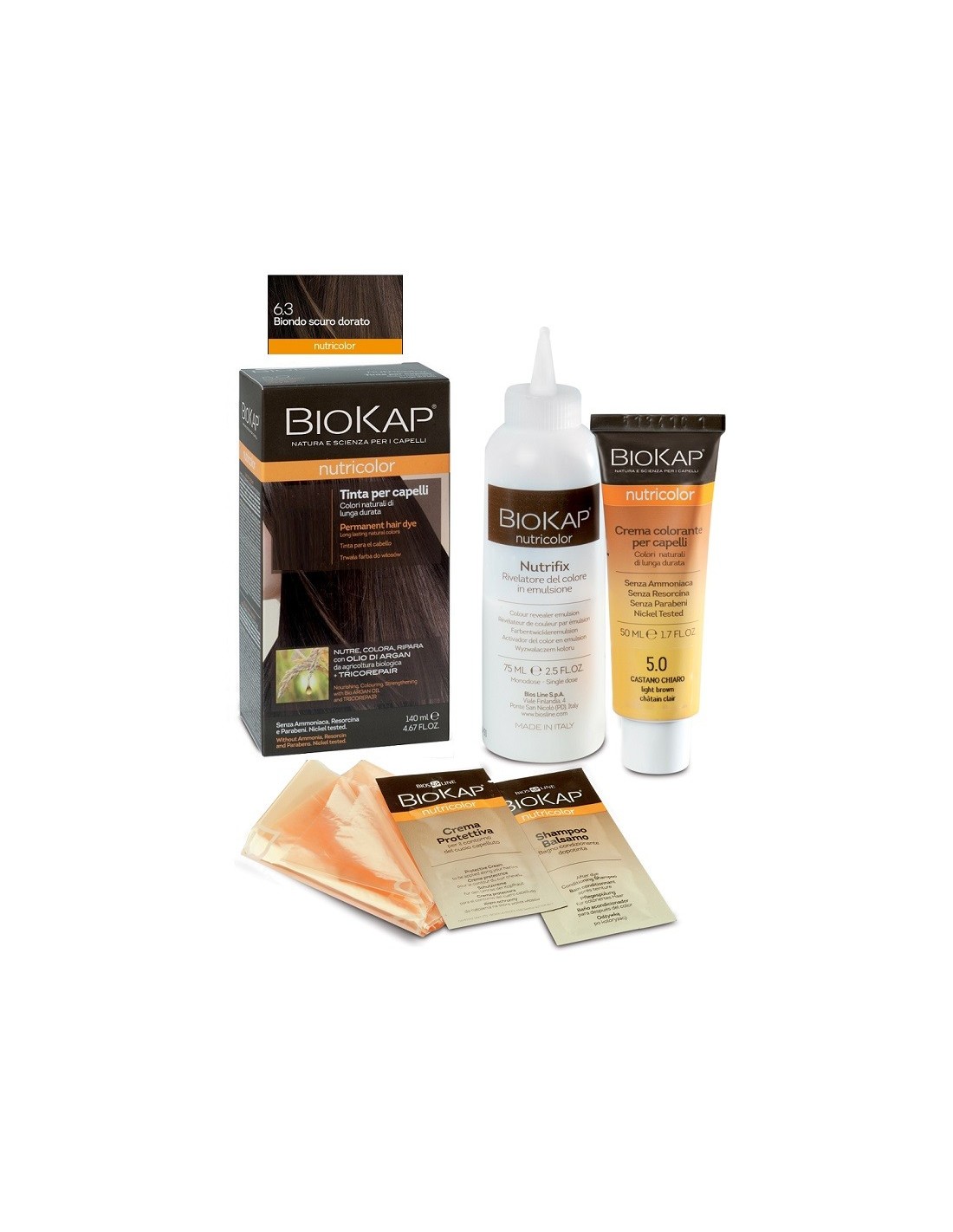Biokap® Nutricolor Tinta è l’alleato prezioso per la colorazione e la bellezza dei capelli. La sua esclusiva formula a base di ingredienti vegetali e ad alta tollerabilità cutanea nutre e ripara i capelli mentre li colora e copre perfettamente i capelli bianchi. La sua formula, con complesso Tricorepair a base di proteine del riso, derivato del salice ed acidi lipofili di frutta è arricchita con olio di Argan da agricoltura biologica, che nutre i capelli e li rende più morbidi e luminosi.