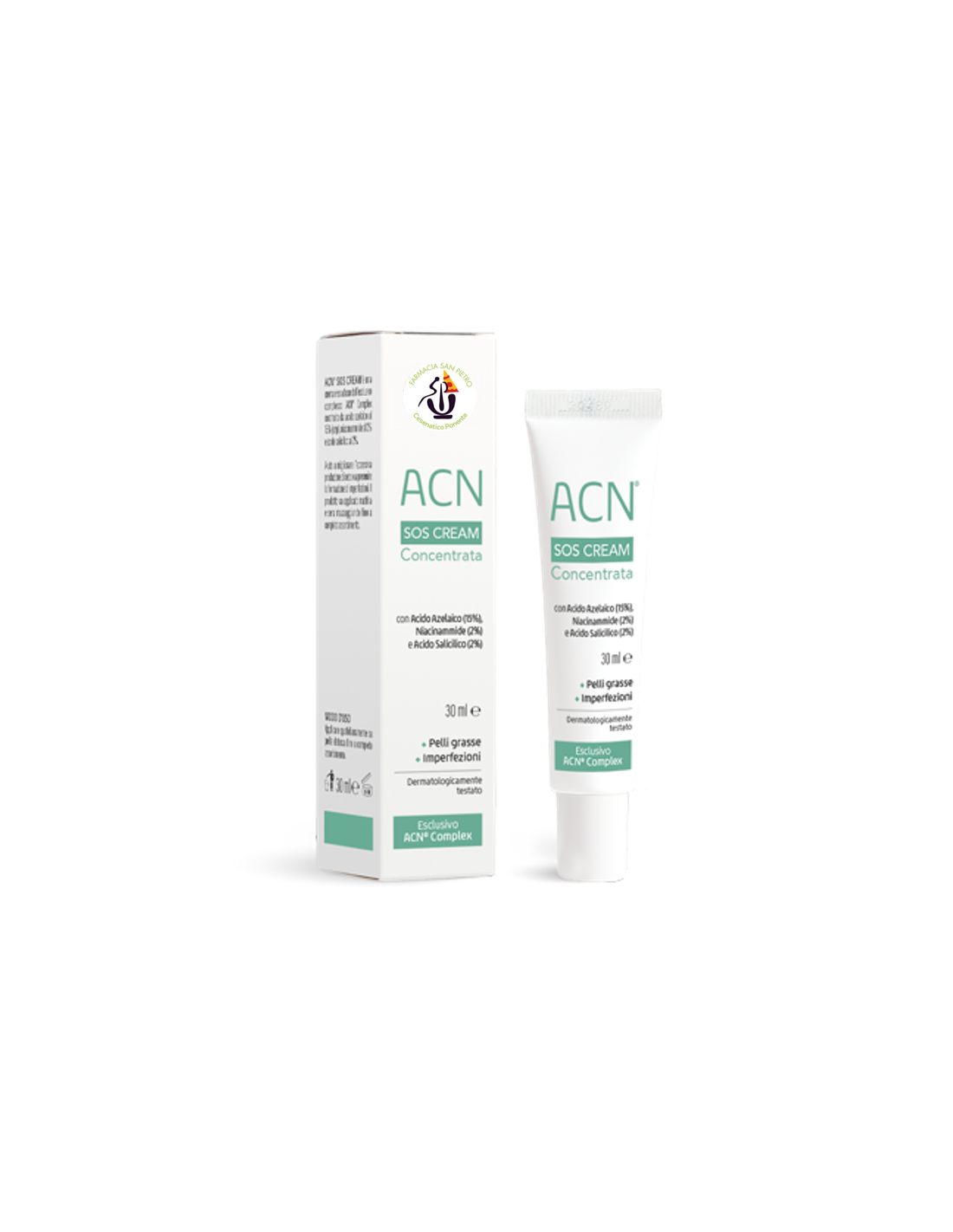ACN® SOS CREAM è una crema viso concentrata a base dell’esclusivo complesso ACN® Complex costituito da acido azelaico al 15% (p/p), niacinamide al 2% e acido salicilico al 2%, utile per la gestione di pelli grasse e imperfezioni. Grazie agli attivi sebo-equilibranti ed esfolianti aiuta a migliorare l’eccessiva produzione di sebo e a prevenire la formazione di imperfezioni.