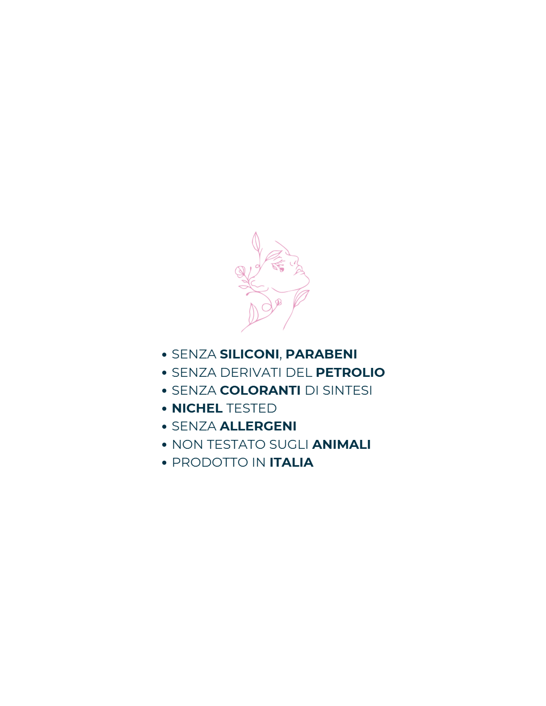 Senza siliconi, parabeni e derivati del petrolio - Senza coloranti di sintesi - Nichel tested - Senza allergeni - Non testato sugli animali - Prodotto in Italia